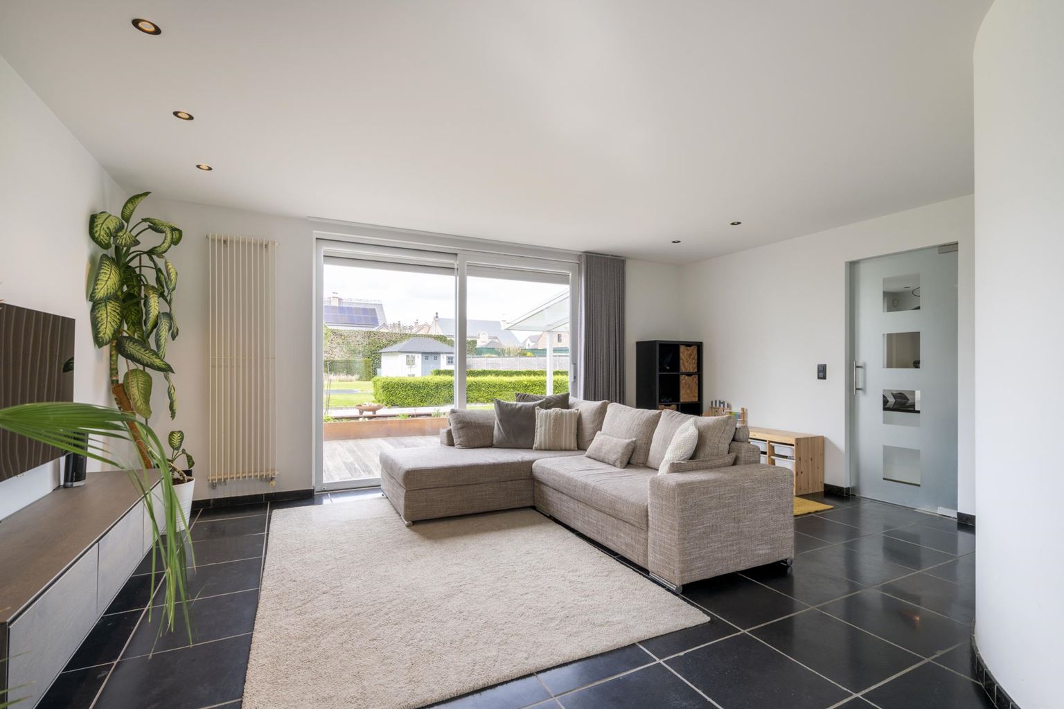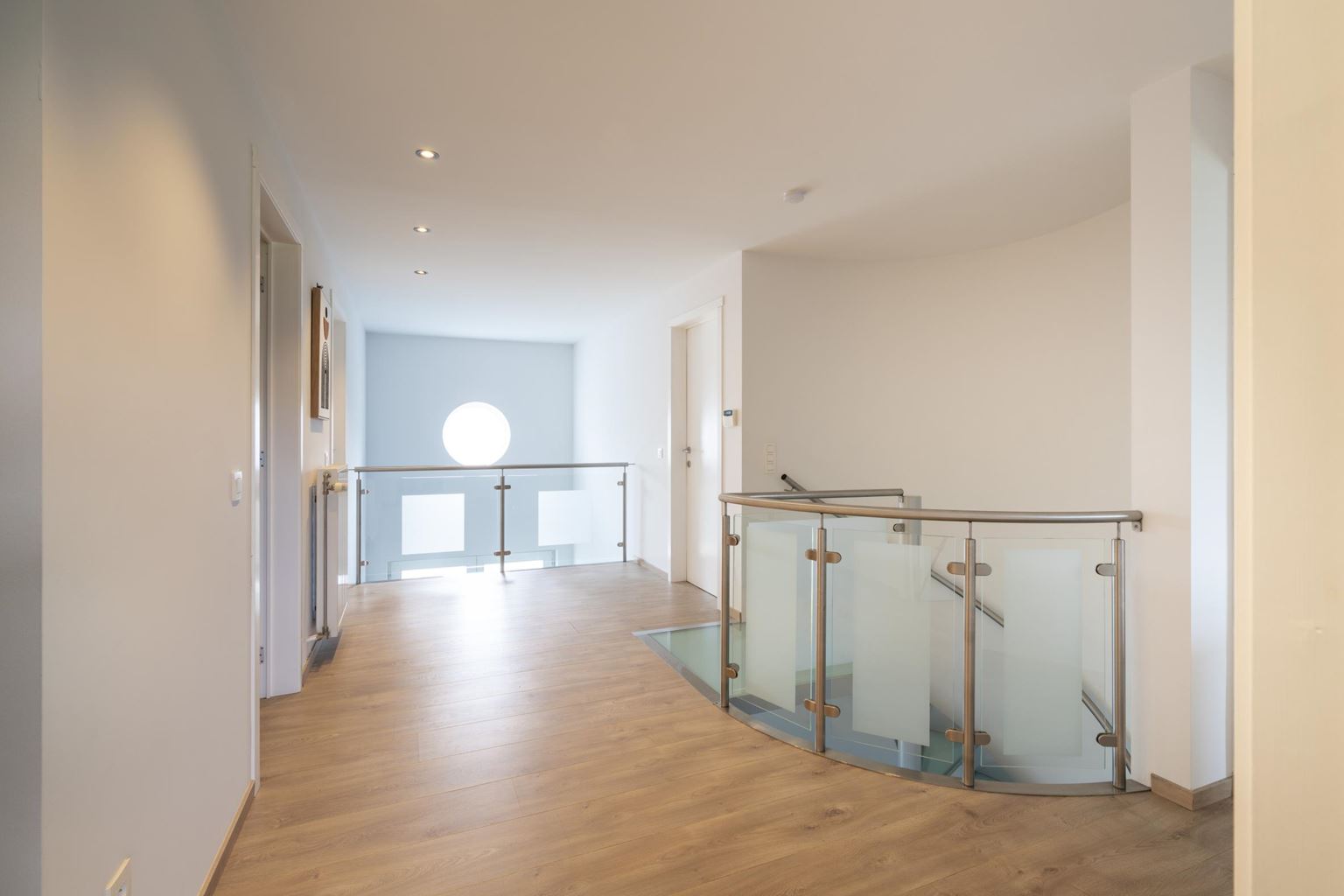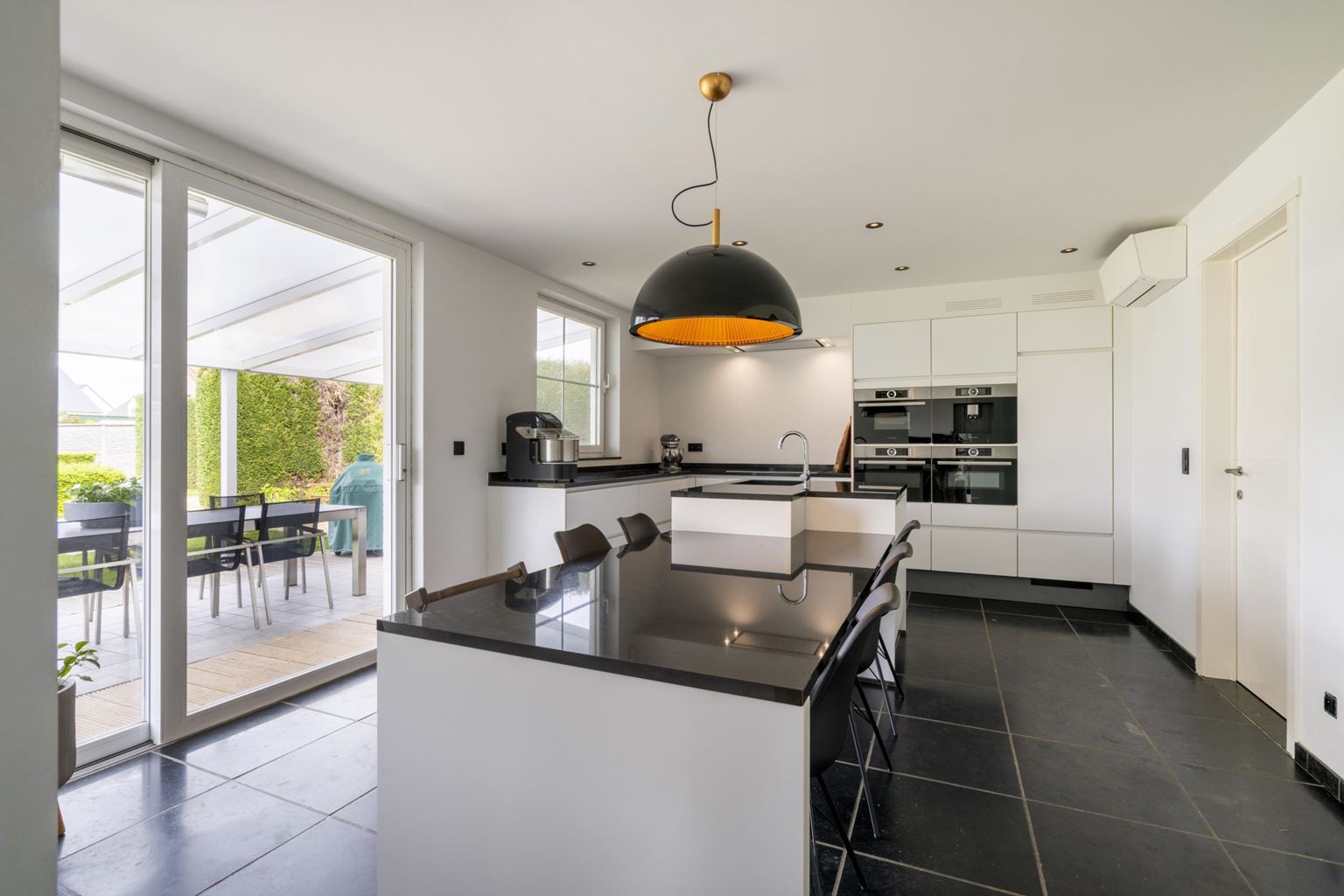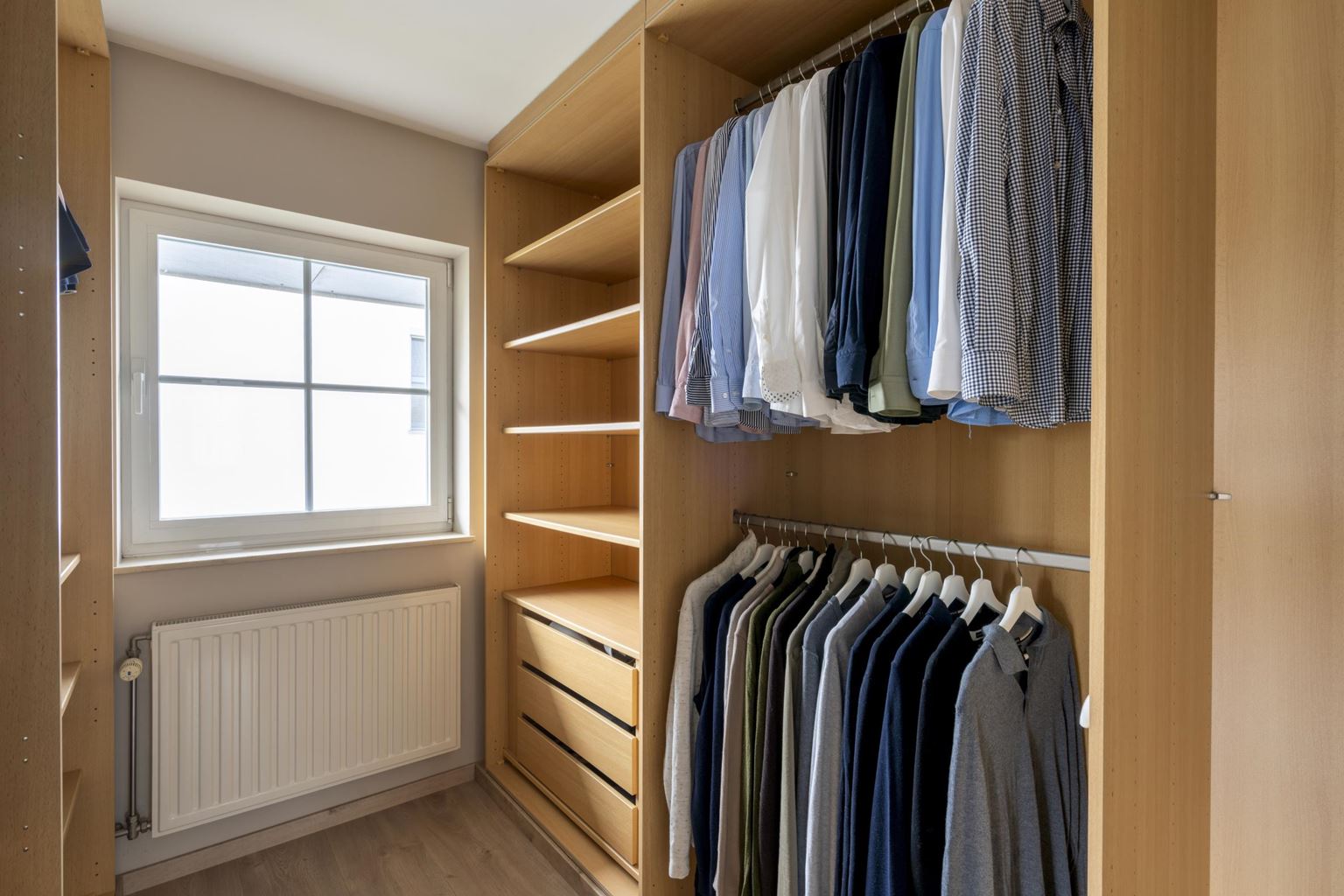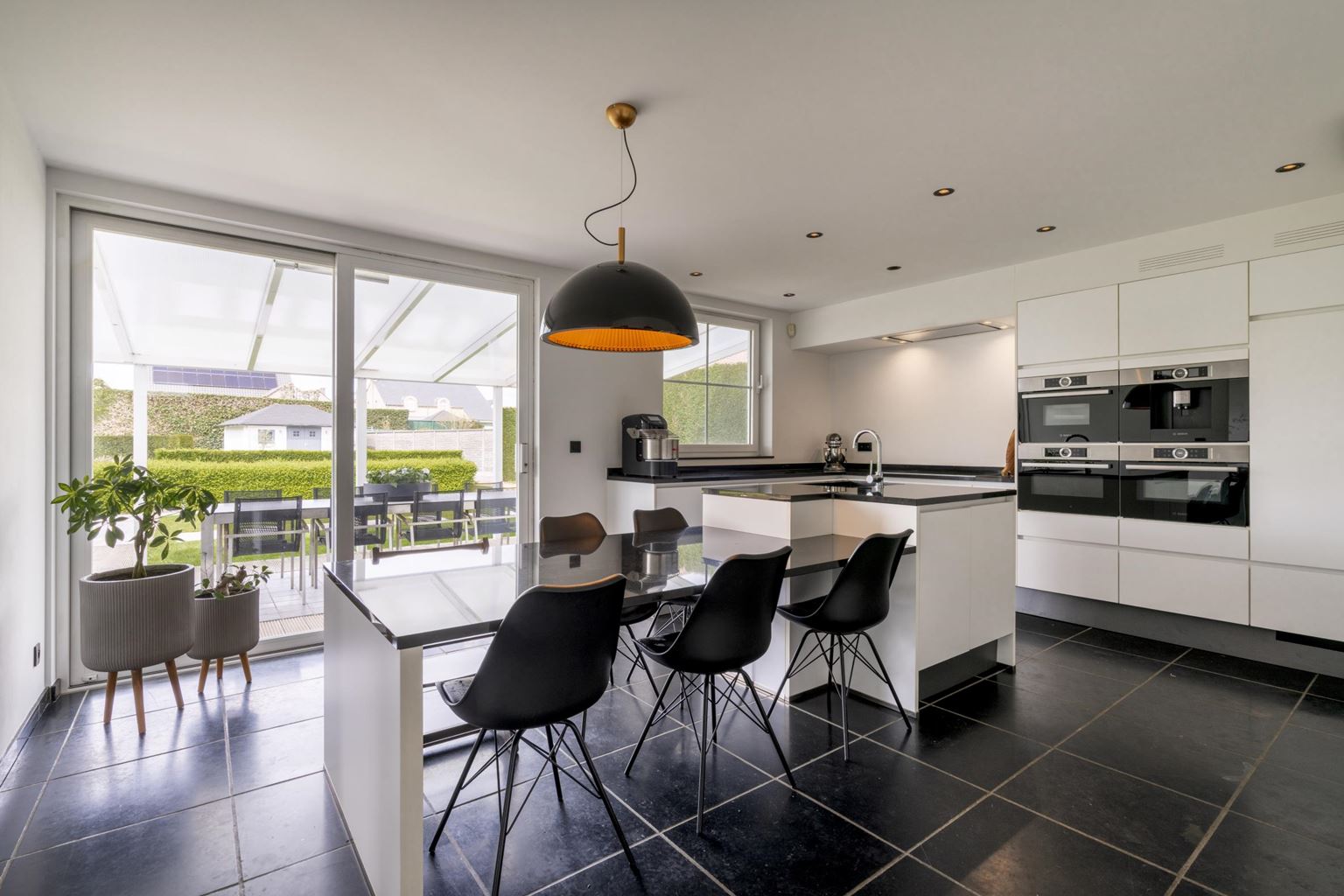 Bij het betreden van de woning wordt u verwelkomd in een ruime inkomhal met apart gastentoilet. Aansluitend bevindt zich een afgewerkte bureauruimte voorzien van inbouwkasten. De lichtrijke leefruimte vormt het hart van de woning en vloeit naadloos over in de volledig uitgeruste keuken. Deze stijlvolle keuken werd vernieuwd in 2016 en is voorzien van hoogwaardige toestellen, waaronder een koelkast, combi-oven, stoomoven, inductiekookplaat, dampkap, een recent vernieuwde vaatwasser (2025) en een ingebouwde koffiemachine.