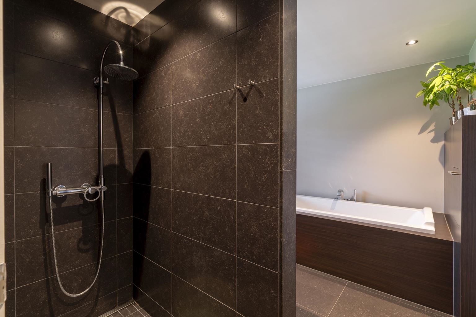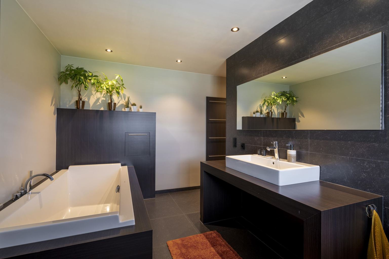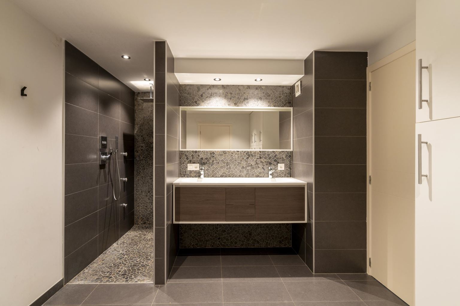 Aansluitend aan de keuken bevindt zich een badkamer, uitgerust met een inloopdouche en een dubbele wastafel geïntegreerd in het meubel. Vanuit deze badkamer is er directe toegang tot de dubbele inpandige garage. In de garage zijn voorzieningen aanwezig voor wasmachine en droogkast.