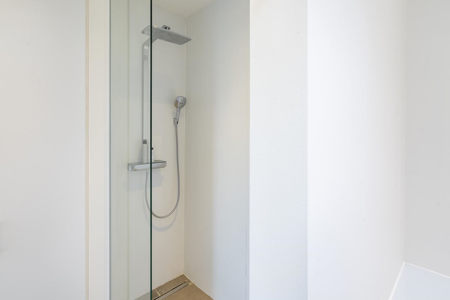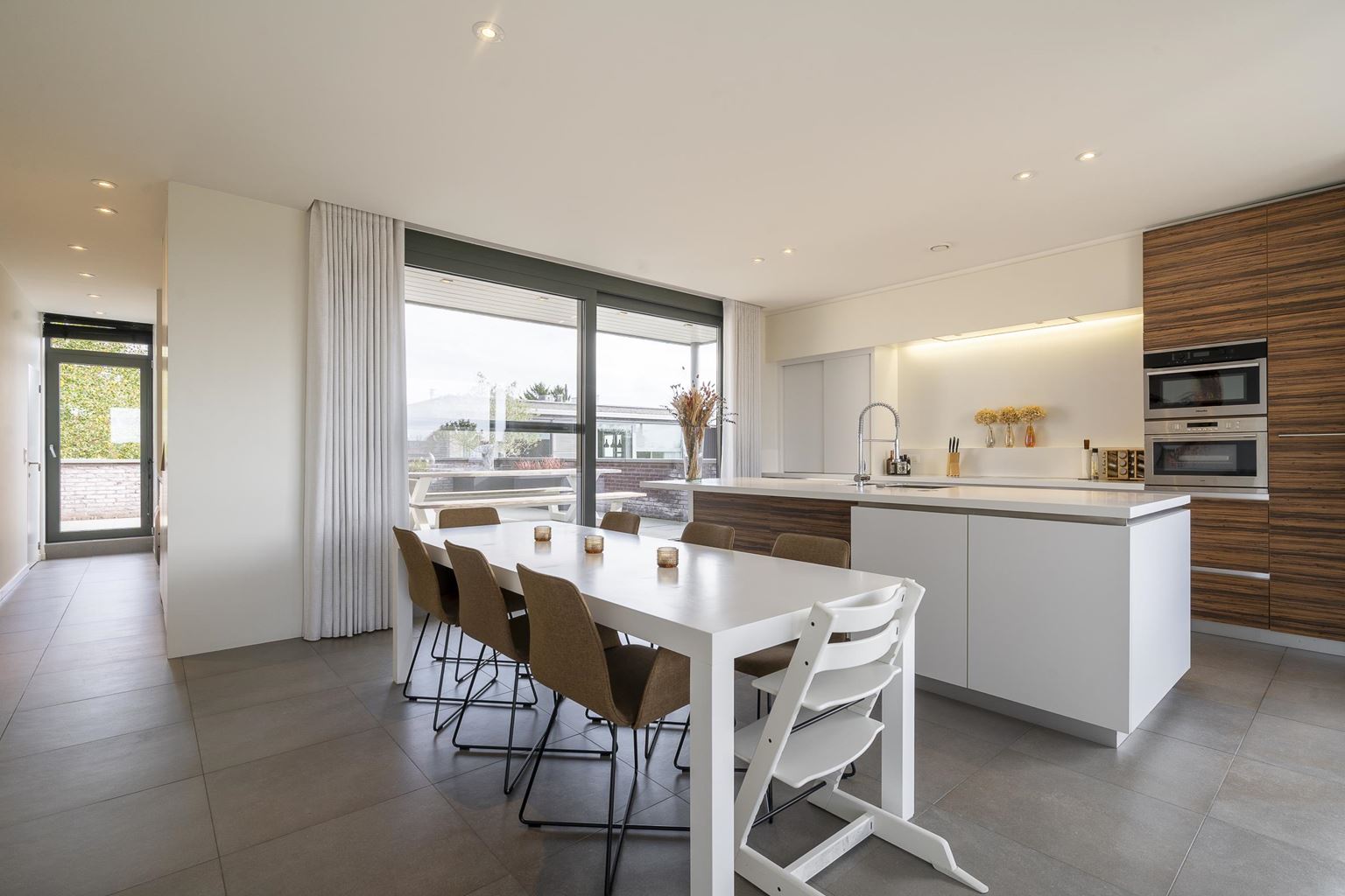 De leefruimte met open maatwerkkeuken vormt het kloppende hart van de woning. Deze keuken is uitgerust met een Corian-werkblad en kwalitatieve inbouwtoestellen (stoomoven, inductiekookplaat, vaatwasser, koelkast en plafondafzuiging). De ruime zithoek beschikt over een ingebouwde gashaard en maatwerkkasten, wat zorgt voor een warme, moderne sfeer.