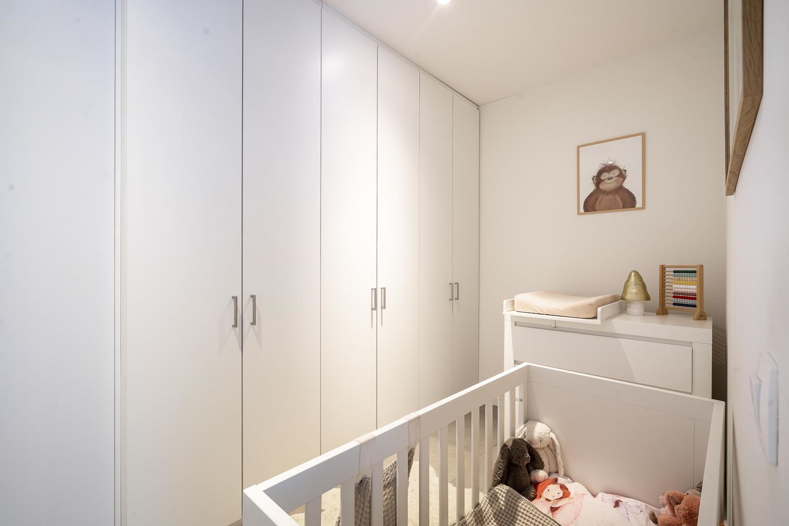 De inkomhal met vestiairewand en aparte berging biedt een praktische indeling. Het slaapgedeelte bestaat uit een masterbedroom, een dressing die ook als tweede slaapkamer kan worden ingericht, en een luxueuze badkamer in Corian met dubbele lavabo, duo-ligbad, inloopdouche en toilet.