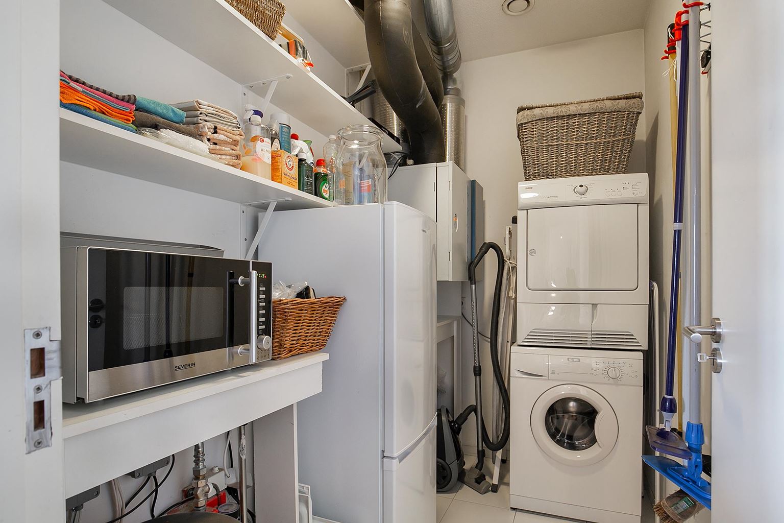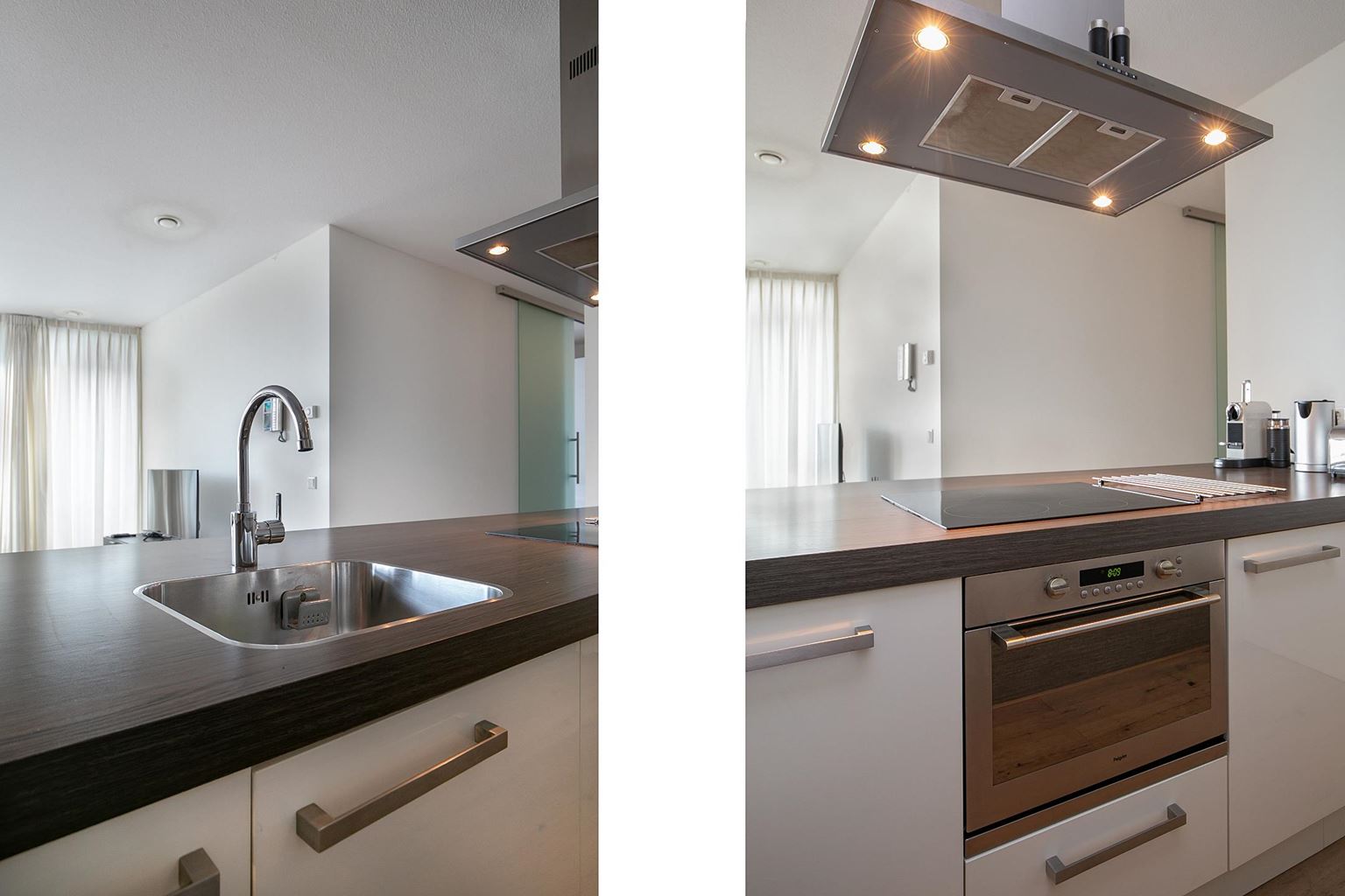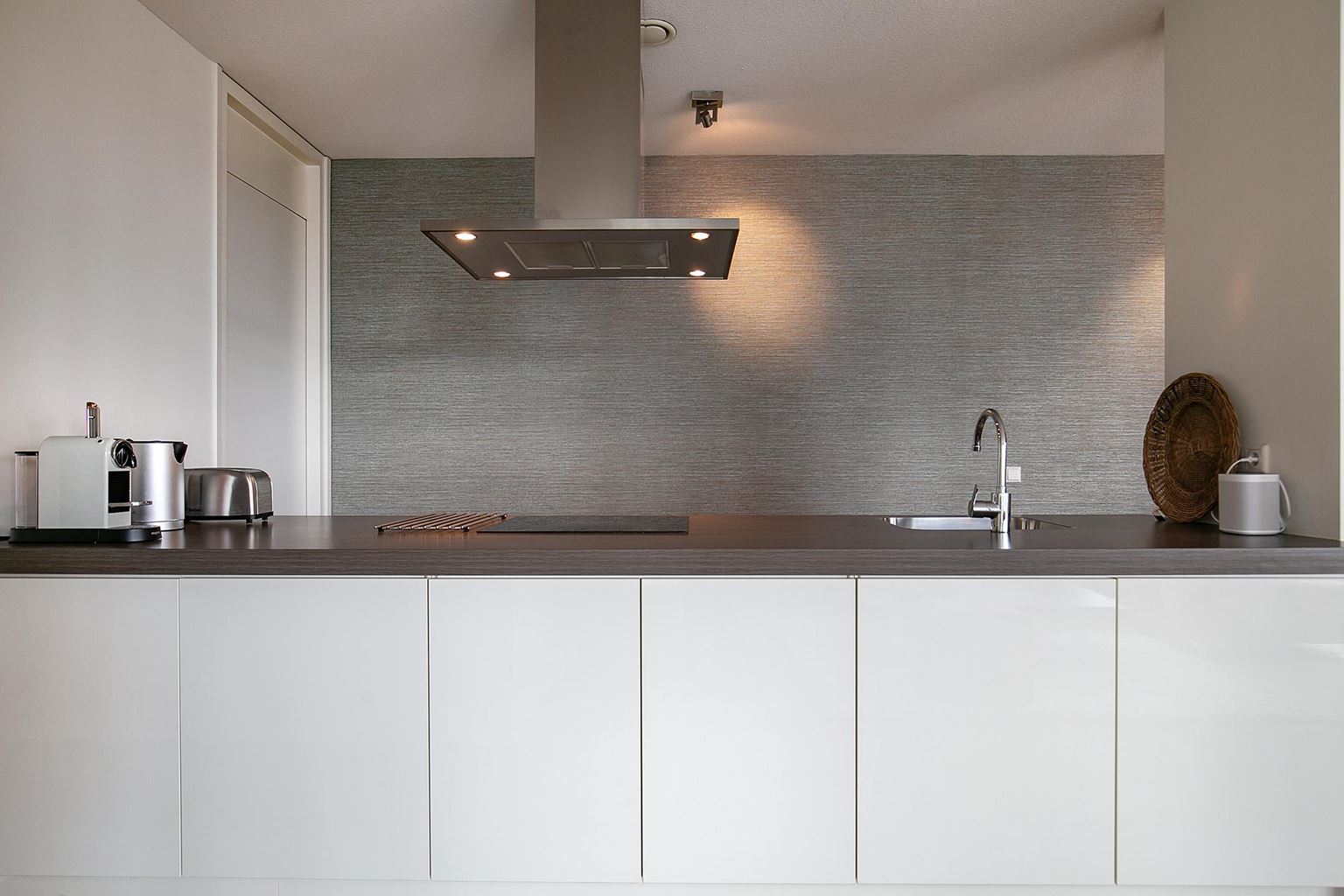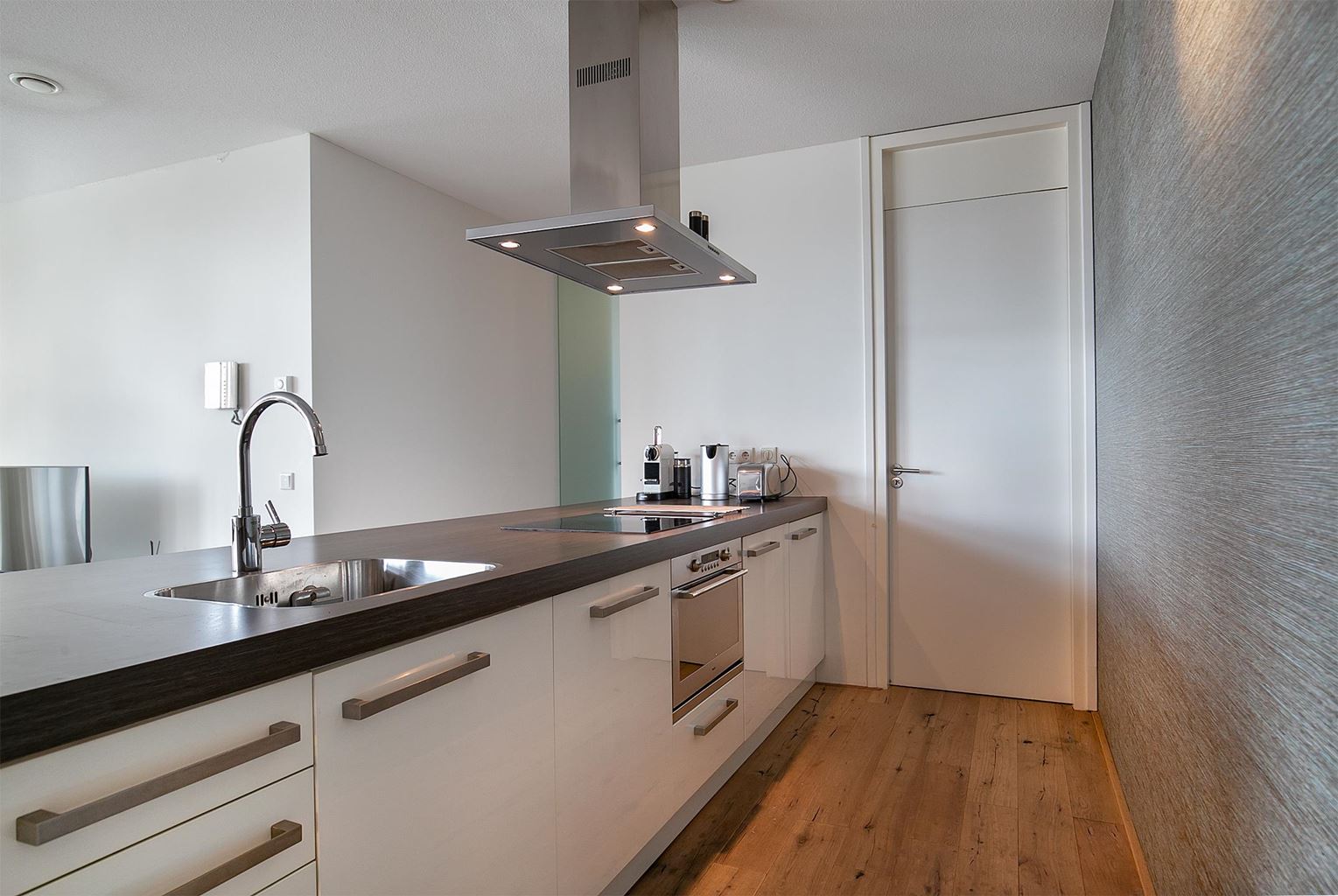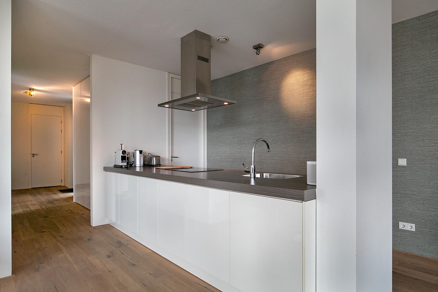 Aansluitend bevindt zich de open keuken, uitgevoerd in een strak en eigentijds design. De keuken is uitgerust met een spoelbak, 4-pits inductiekookplaat, afzuigkap, oven en vaatwasser. Direct naast de keuken ligt een afgesloten bijkeuken met wasmachine, droger en een koelkast met vriesvak.