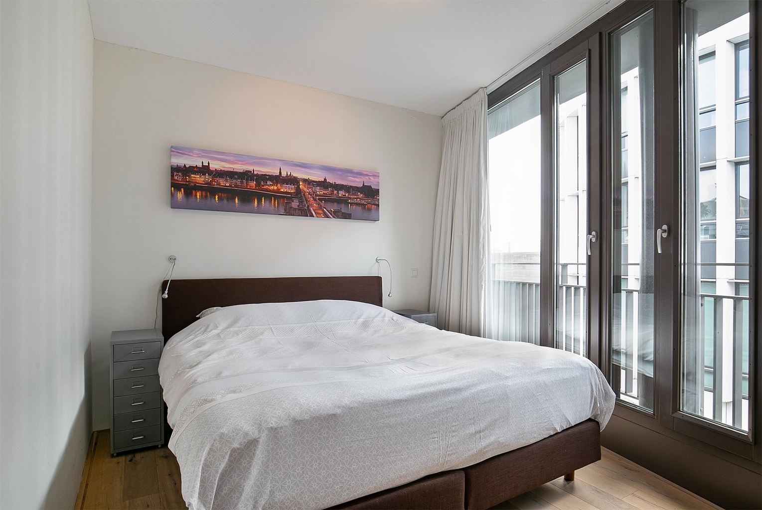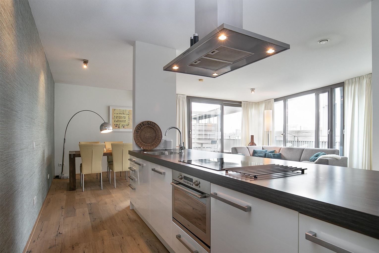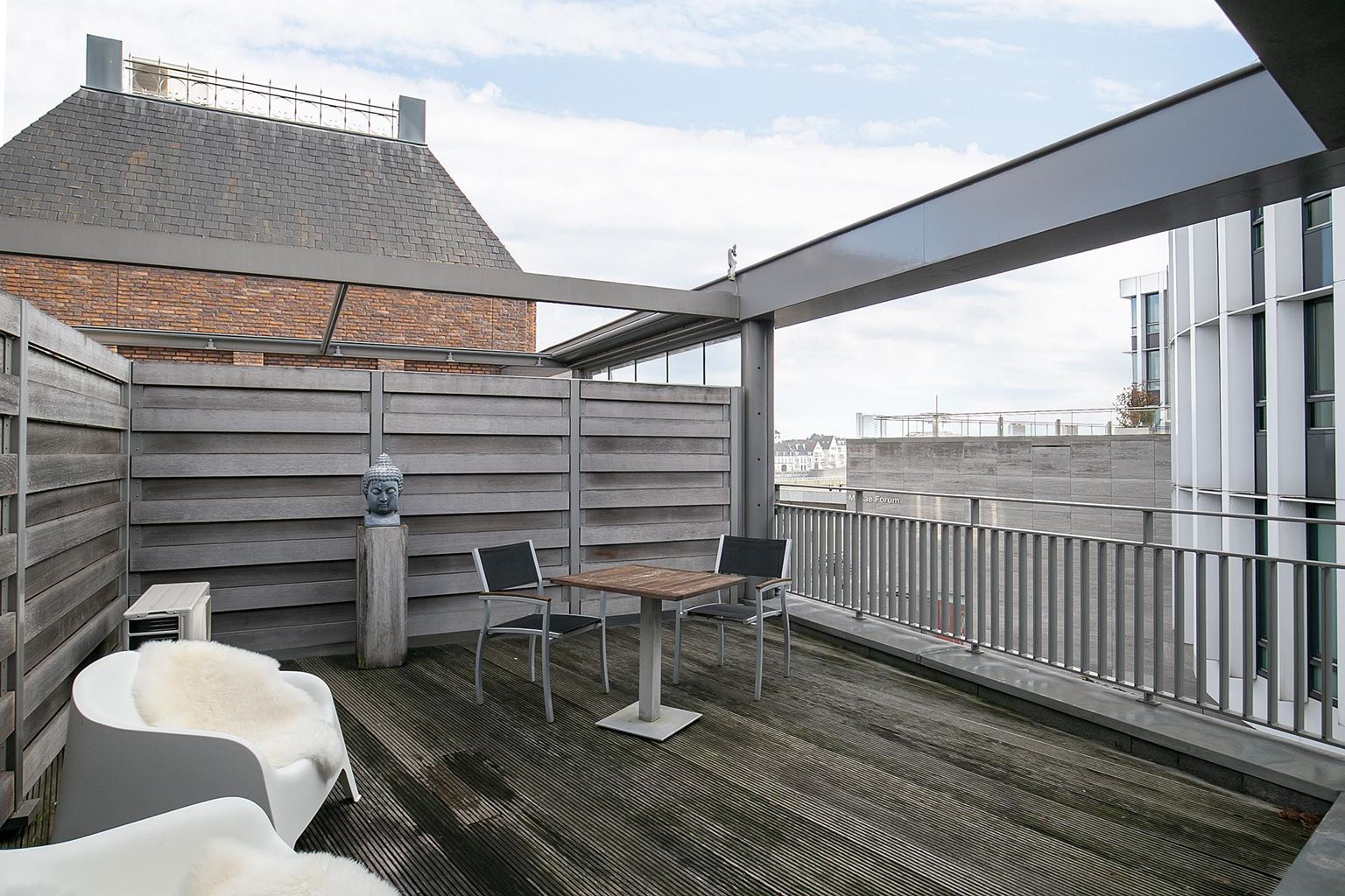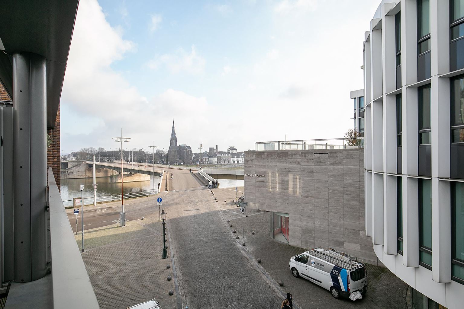 Via de woonkamer heeft men toegang tot het royale dakterras, waar men in alle rust kan genieten van het uitzicht over de Maas en de levendige omgeving van het Mosae Forum.