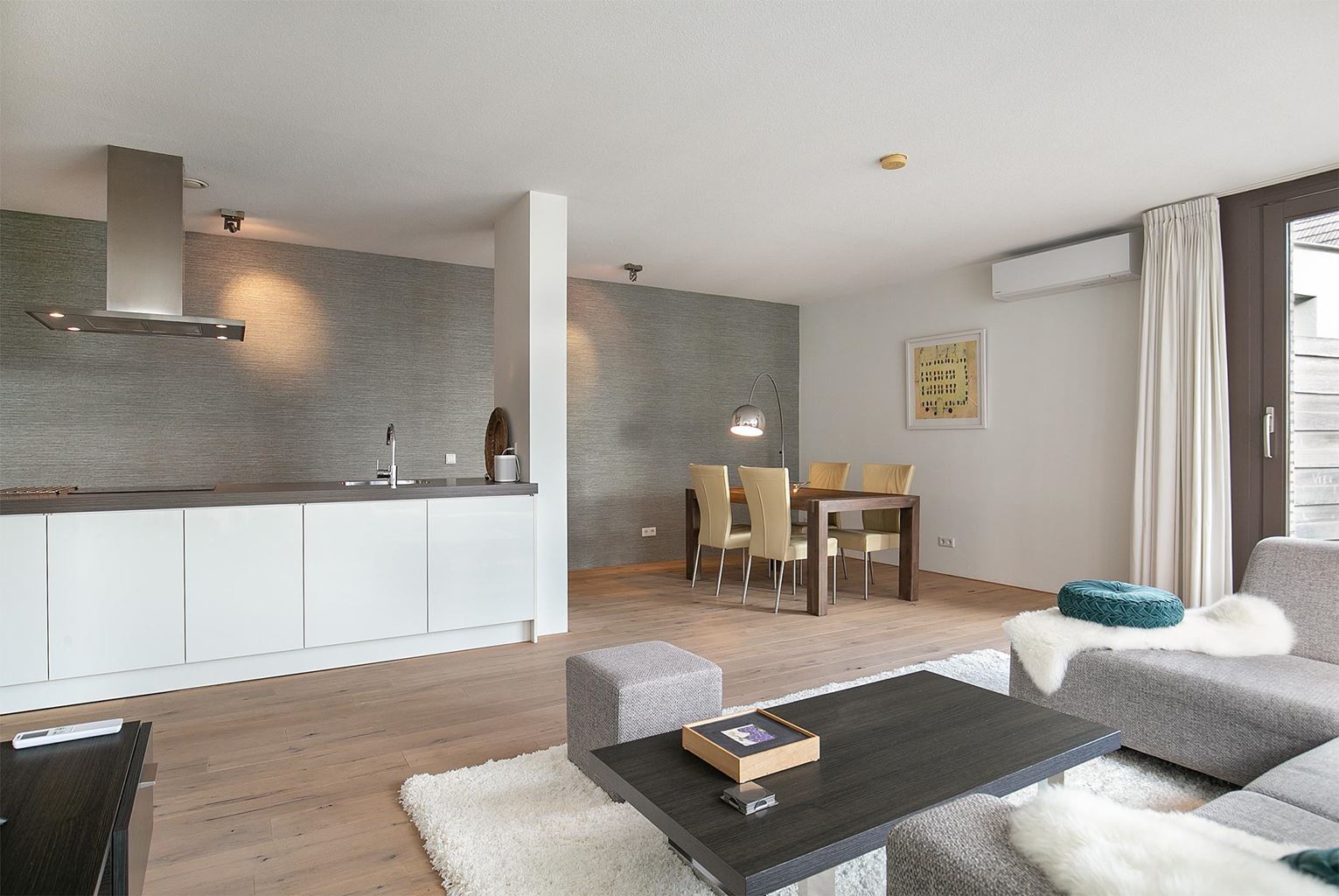 Bij binnenkomst betreedt men de hal met een stijlvolle, strakke kastenwand die tevens dienstdoet als garderobe. Vanuit de hal heeft men toegang tot de ruime woonkamer, die dankzij de grote raampartijen geniet van een overvloed aan natuurlijk licht. De woonkamer is modern ingericht en voorzien van een vaste airconditioning, wat zorgt voor een aangenaam binnenklimaat gedurende het hele jaar.