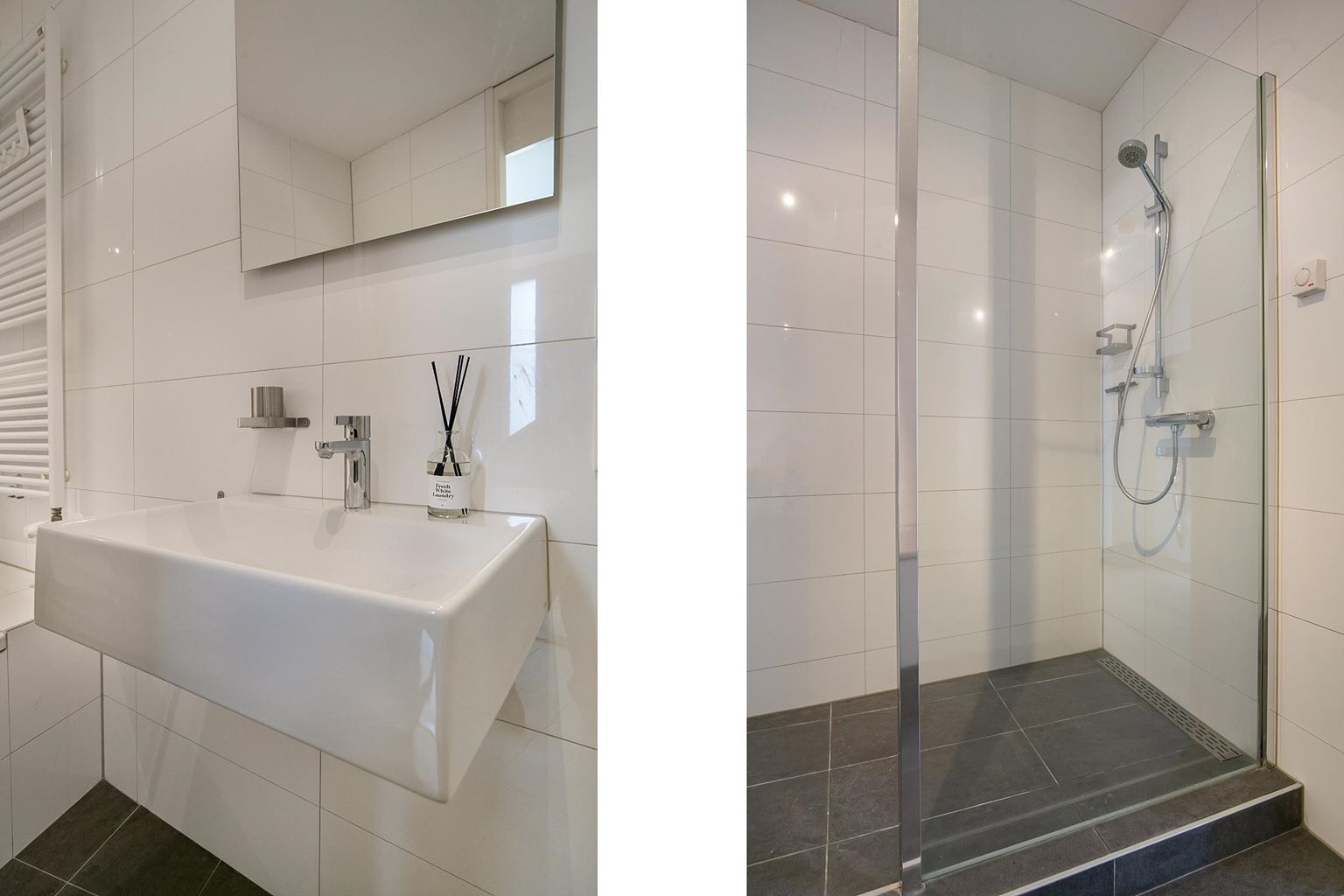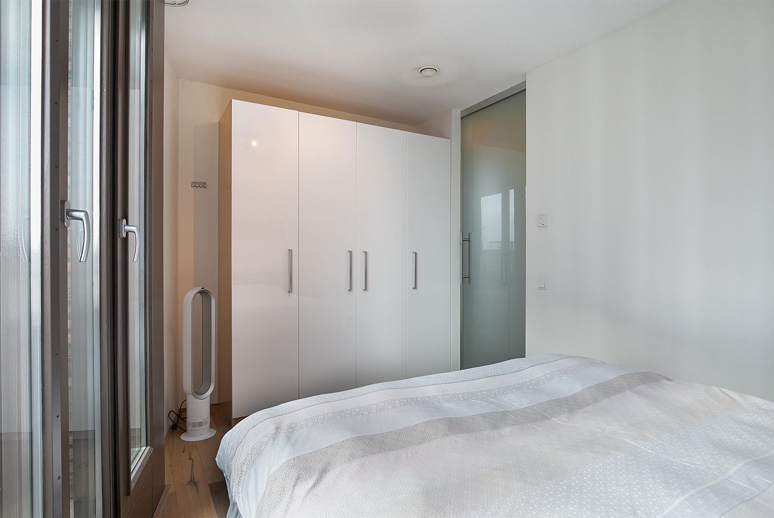 De slaapkamer is voorzien van een ruime 4-deurs garderobekast en een staande Dyson airconditioning. De smaakvol ingerichte badkamer beschikt over een ligbad, inloopdouche en enkele wastafel. Daarnaast is er een separate, moderne toiletruimte met wandcloset en fonteintje.
