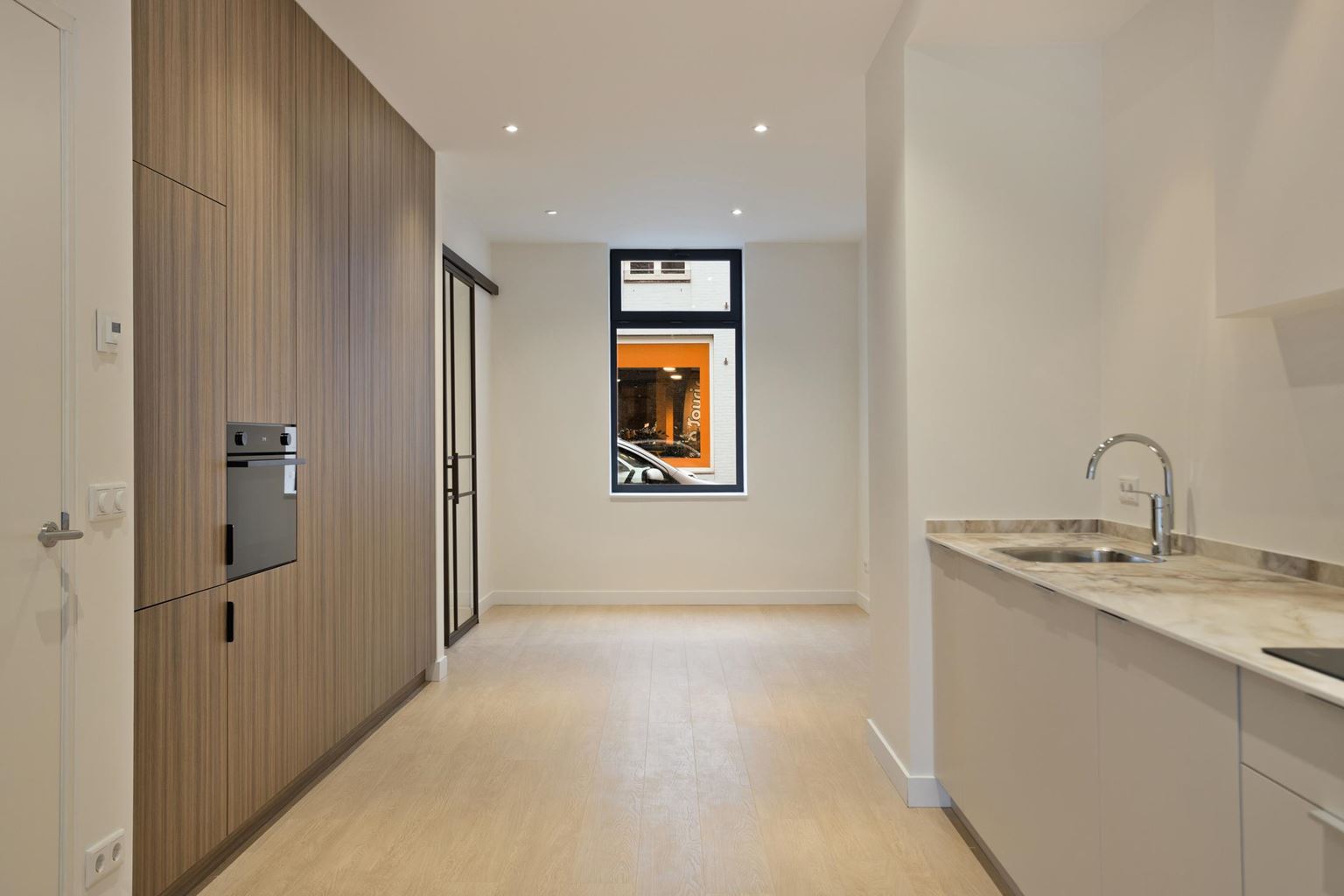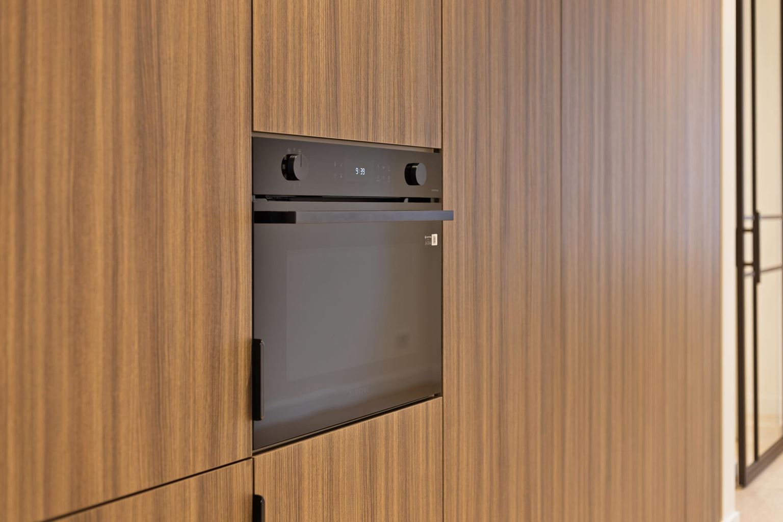 De keuken bevindt zich centraal in de woning en vormt het hart van het huis. Deze is hoogwaardig afgewerkt met een strak en naadloos weggewerkte wand met veel kastruimte en geïntegreerde apparatuur, waaronder een koel-vriescombinatie, combi-oven en vaatwasser. Aan de andere zijde bevinden zich het kookgedeelte en de spoelbak, wat zorgt voor een praktische en ruimtelijke opstelling.