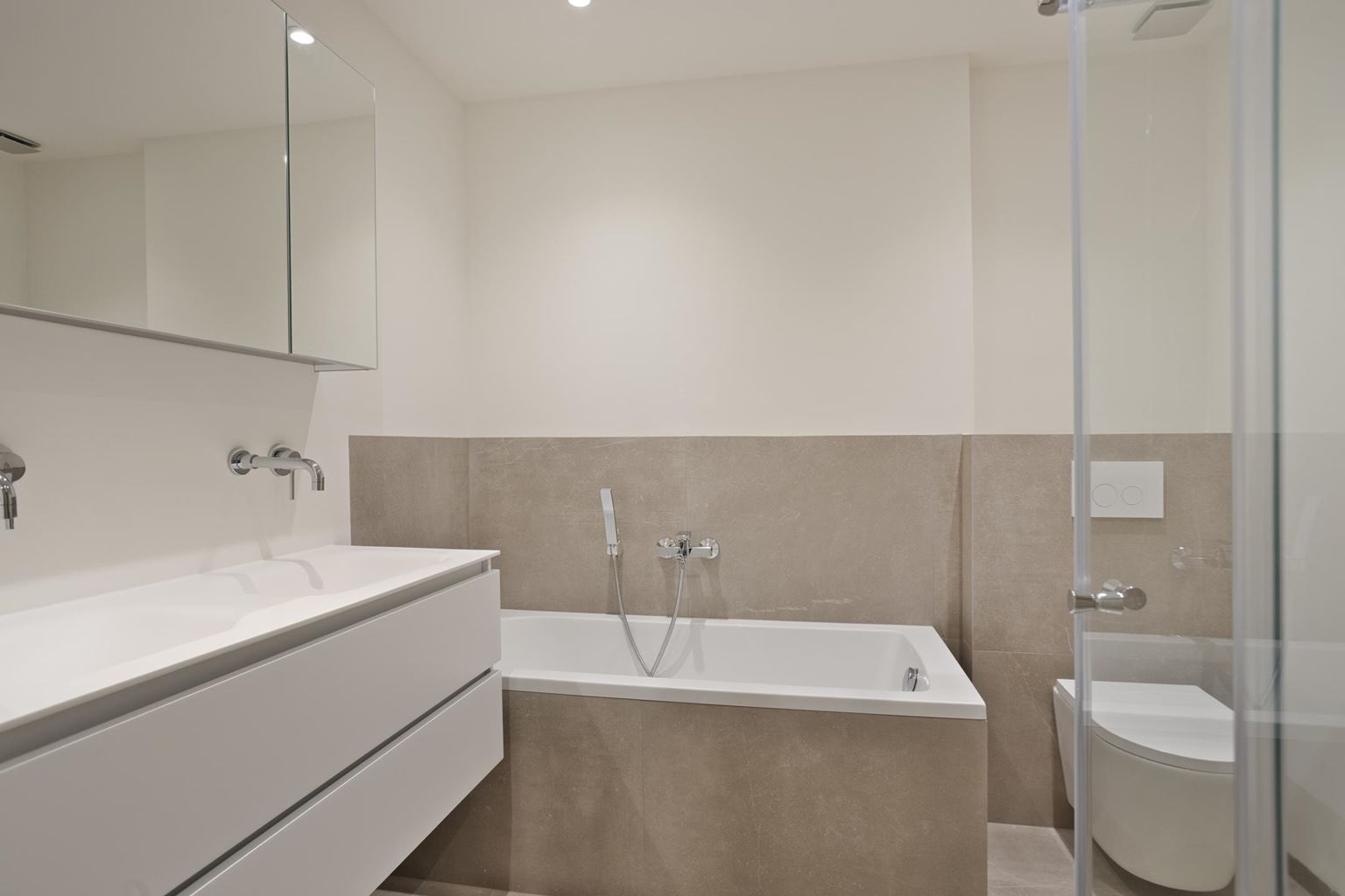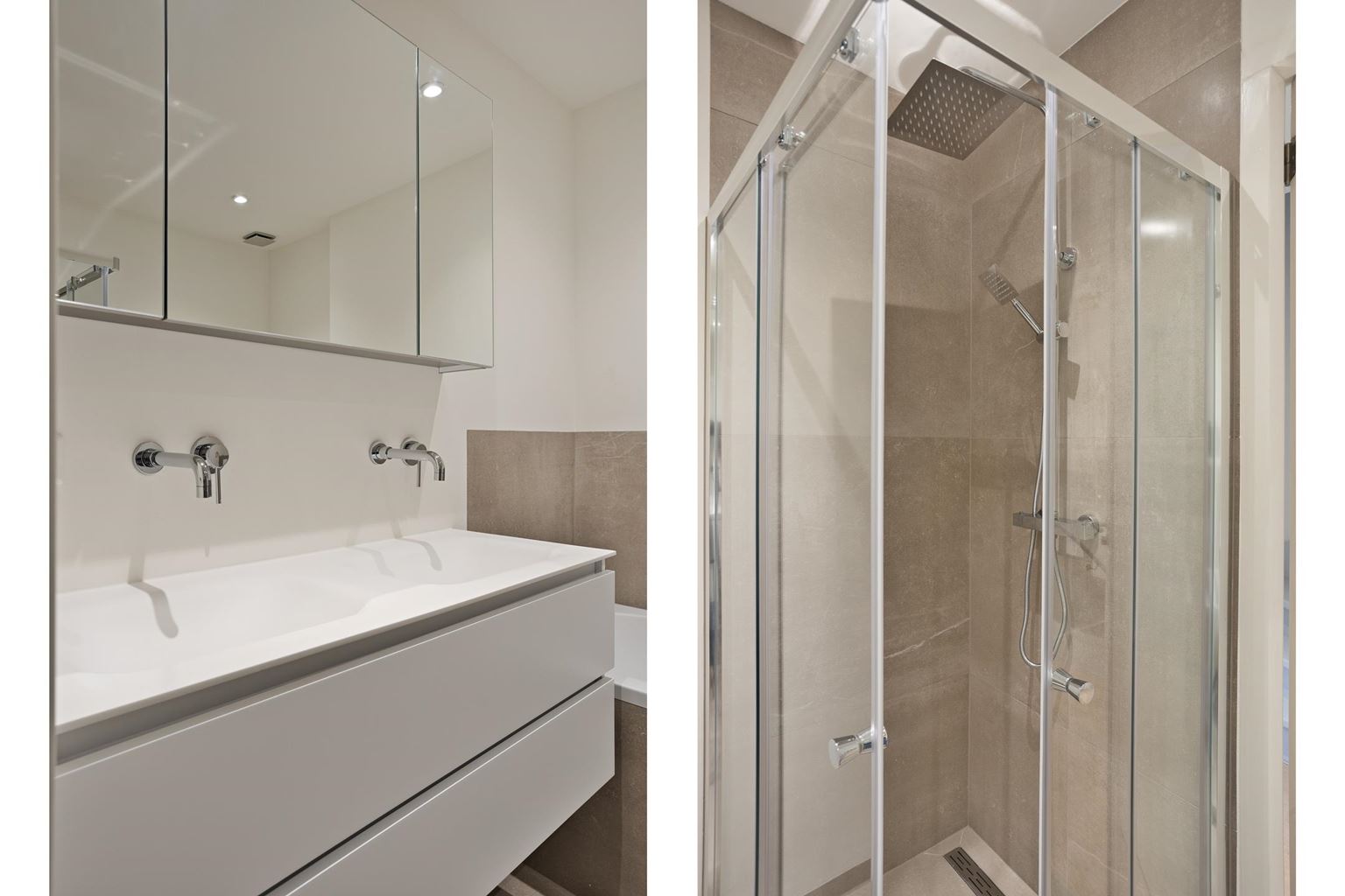 Overloop met toegang tot twee goed bemeten slaapkamers, beide voorzien van praktische inbouwkasten. De moderne en ruime badkamer is hoogwaardig afgewerkt en voorzien van een ligbad, inloopdouche, dubbel wastafelmeubel en toilet.