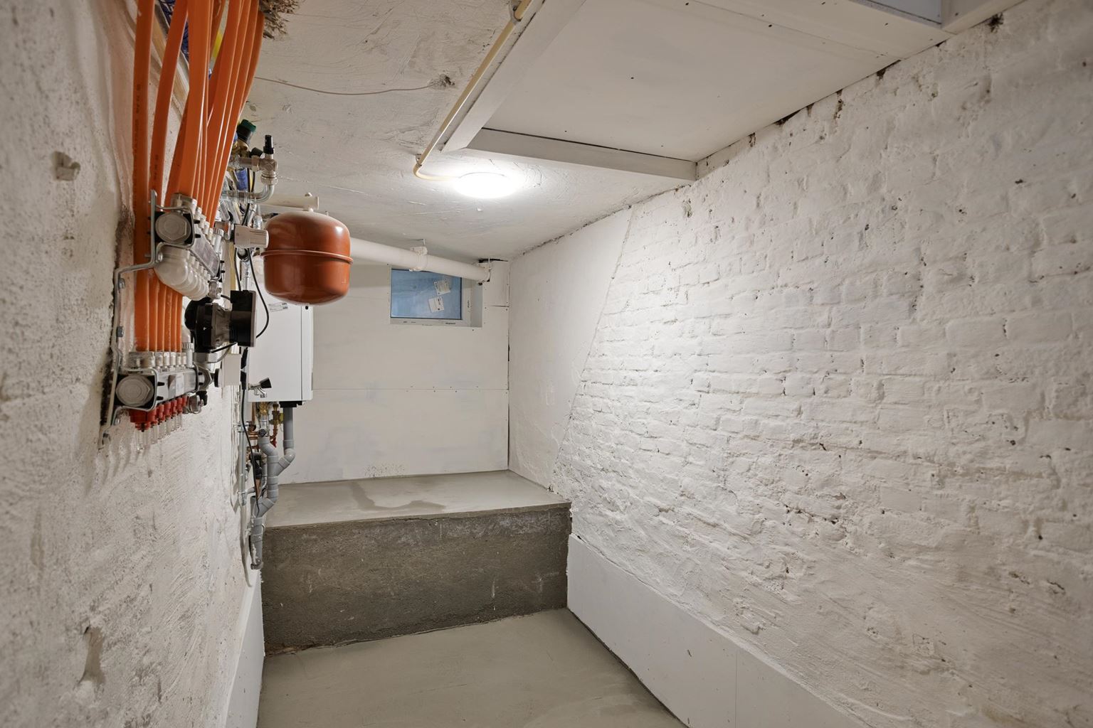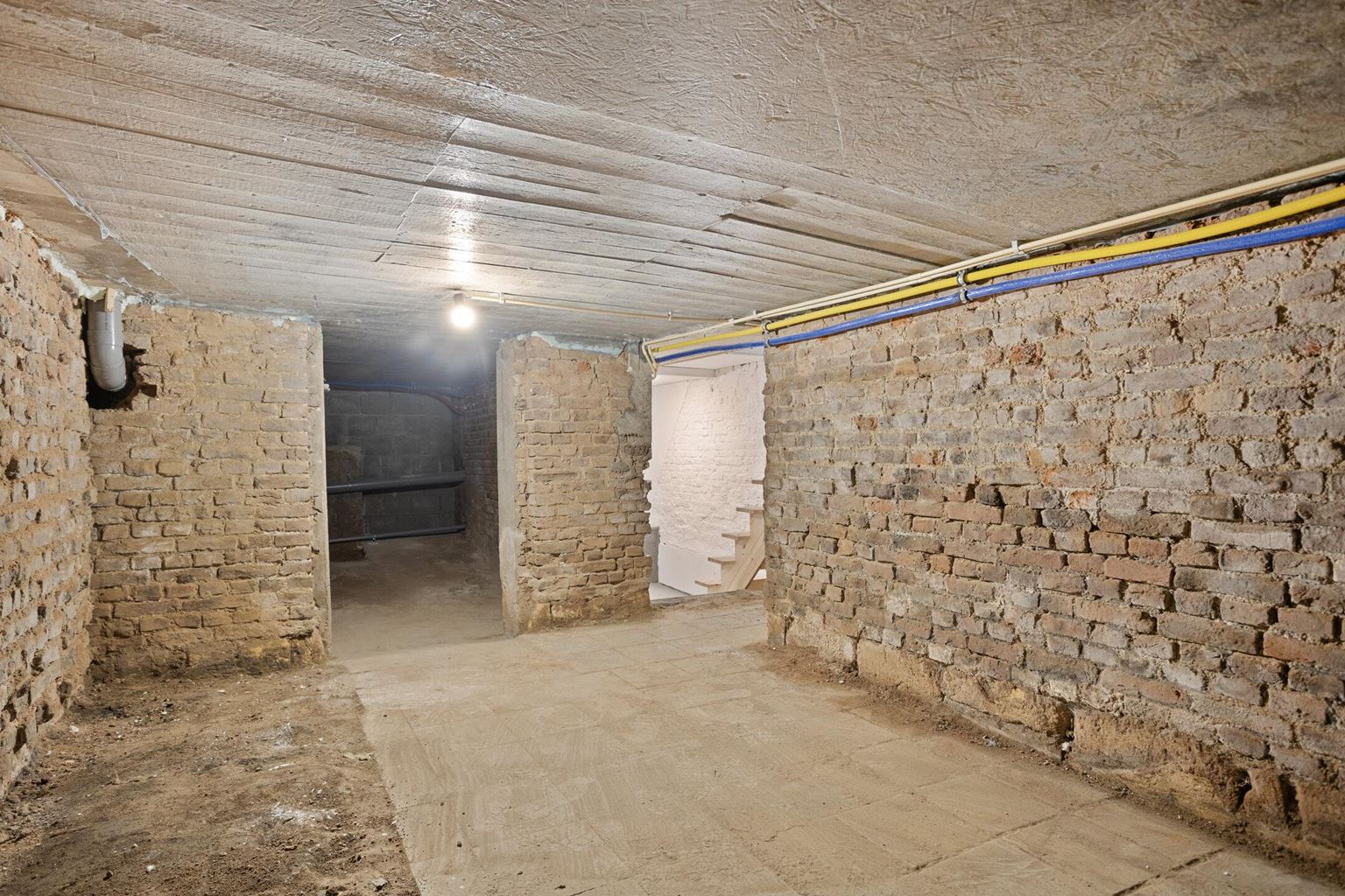 Praktische kelderruimte met aansluiting voor wasmachine, ideaal voor extra bergruimte en huishoudelijke voorzieningen.