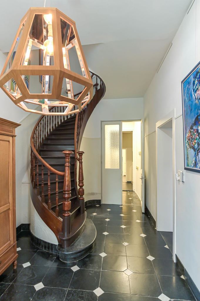 De representatieve entree met hardstenen vloer leidt naar de ruime hal met trap naar de eerste verdieping. De woonkamer bestaat uit twee gedeelten met houten vloeren, stucwerk en twee marmeren haardpartijen.