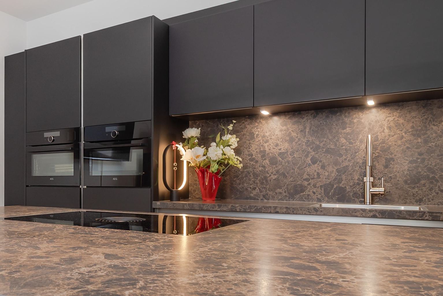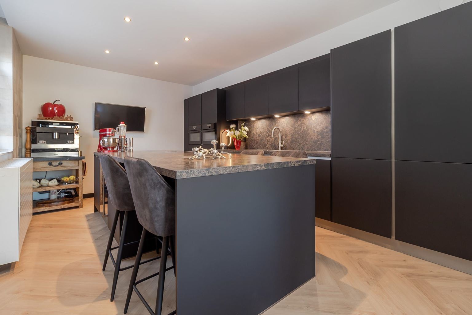 De open keuken (20m²) sluit fraai aan op het eetgedeelte en is uitgevoerd met een modern kookeiland en een composiet aanrechtblad. De keuken is voorzien van hoogwaardige inbouwapparatuur, waaronder een 4-pits inductiekookplaat met geïntegreerde afzuiging (Bora), combimagnetron, stoomoven, koelkast, vriezer, wijnkast, vaatwasser, Quooker en een spoelbak.