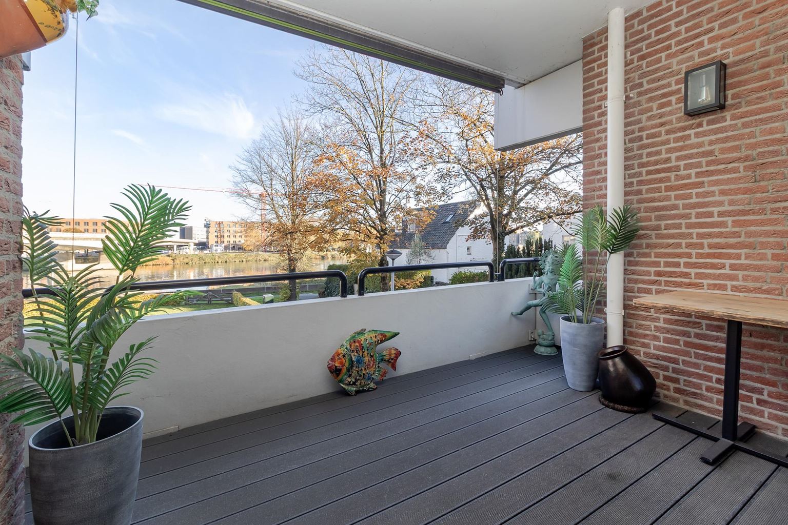 Via een stijlvolle glazen openslaande deur bereikt u de royale woonkamer (62m²), die is opgedeeld in een zit- en eetgedeelte en voorzien van een airco-installatie. Deze indeling bevordert een optimaal en comfortabel gebruik van de leefruimte. De open haard mag volgens de VvE niet meer gebruikt worden, maar biedt wel de mogelijkheid voor het plaatsen van een elektrische variant. Via de schuifpui bereikt u het ruime balkon met kunststof vlonderplanken, waar u kunt genieten van uitzicht op de binnentuin, rivier de Maas en het Bonnefantenmuseum.