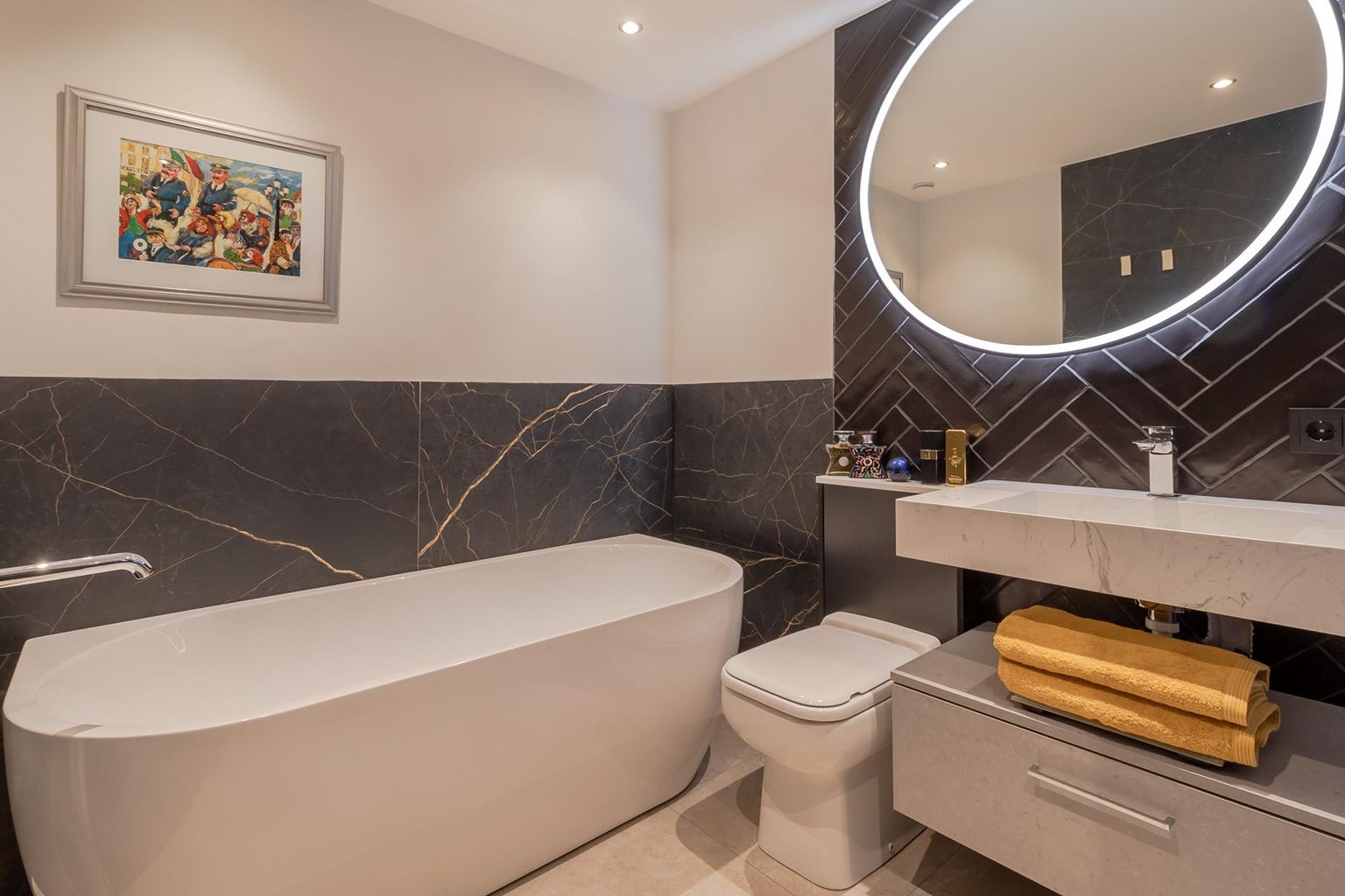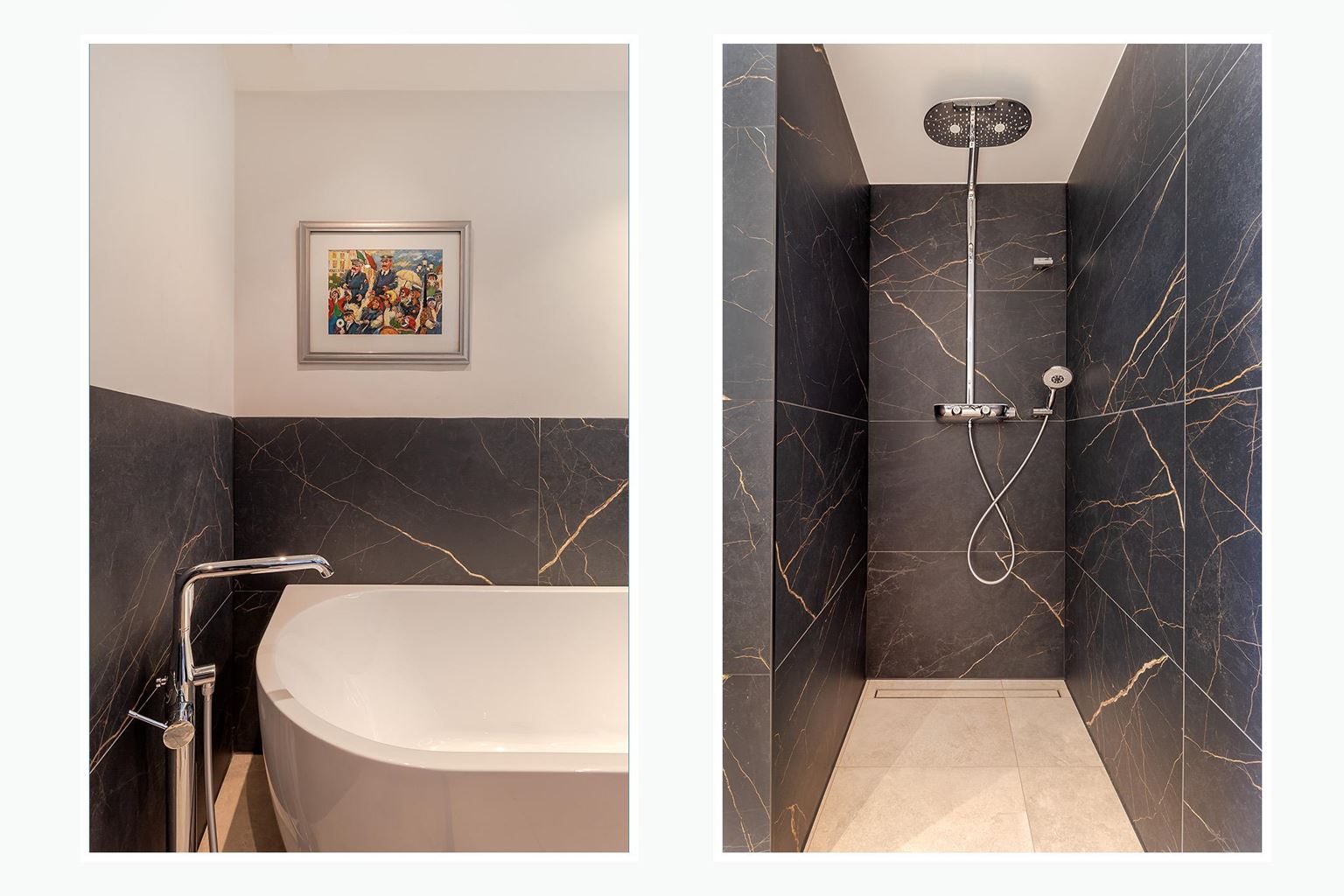 Slaapkamer 2 (19m²) is eveneens ruim van opzet en biedt toegang tot het balkon aan de voorzijde. Vanuit deze kamer is de moderne luxe badkamer (6m²) bereikbaar, voorzien van een losstaand ligbad, vaste wastafel in ombouwmeubel, inloopdouche met regenfunctie en een sanibroyeur.