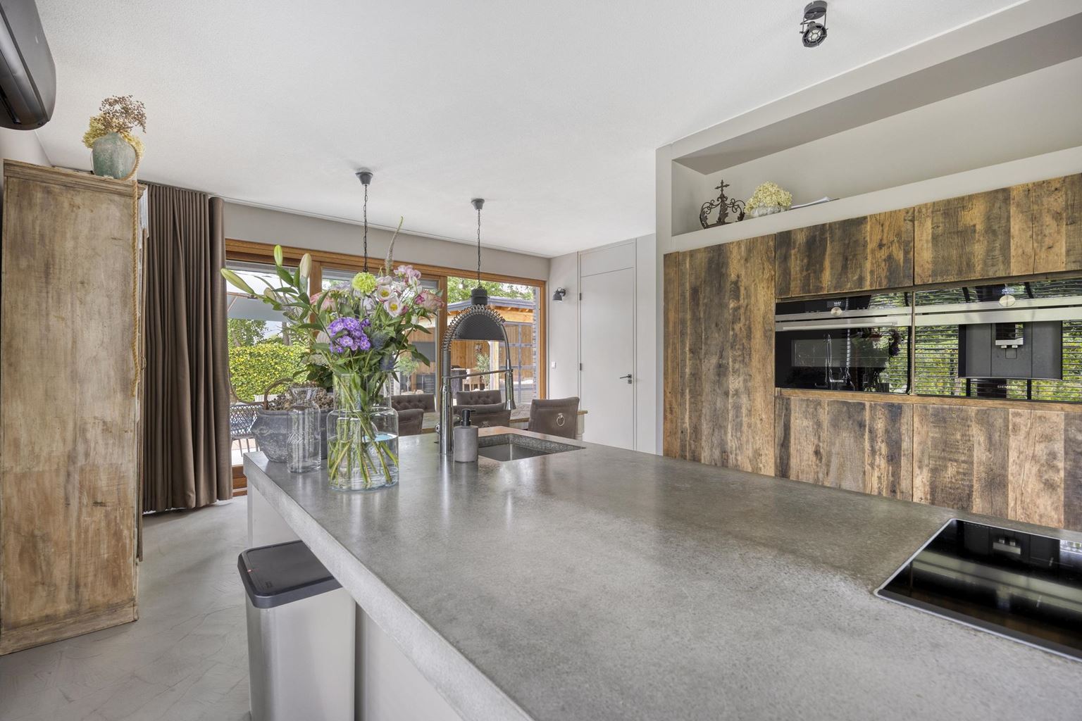 Naast de woning ligt de ruime garage, welke grotendeels vervaardigd is van duurzaam hout.